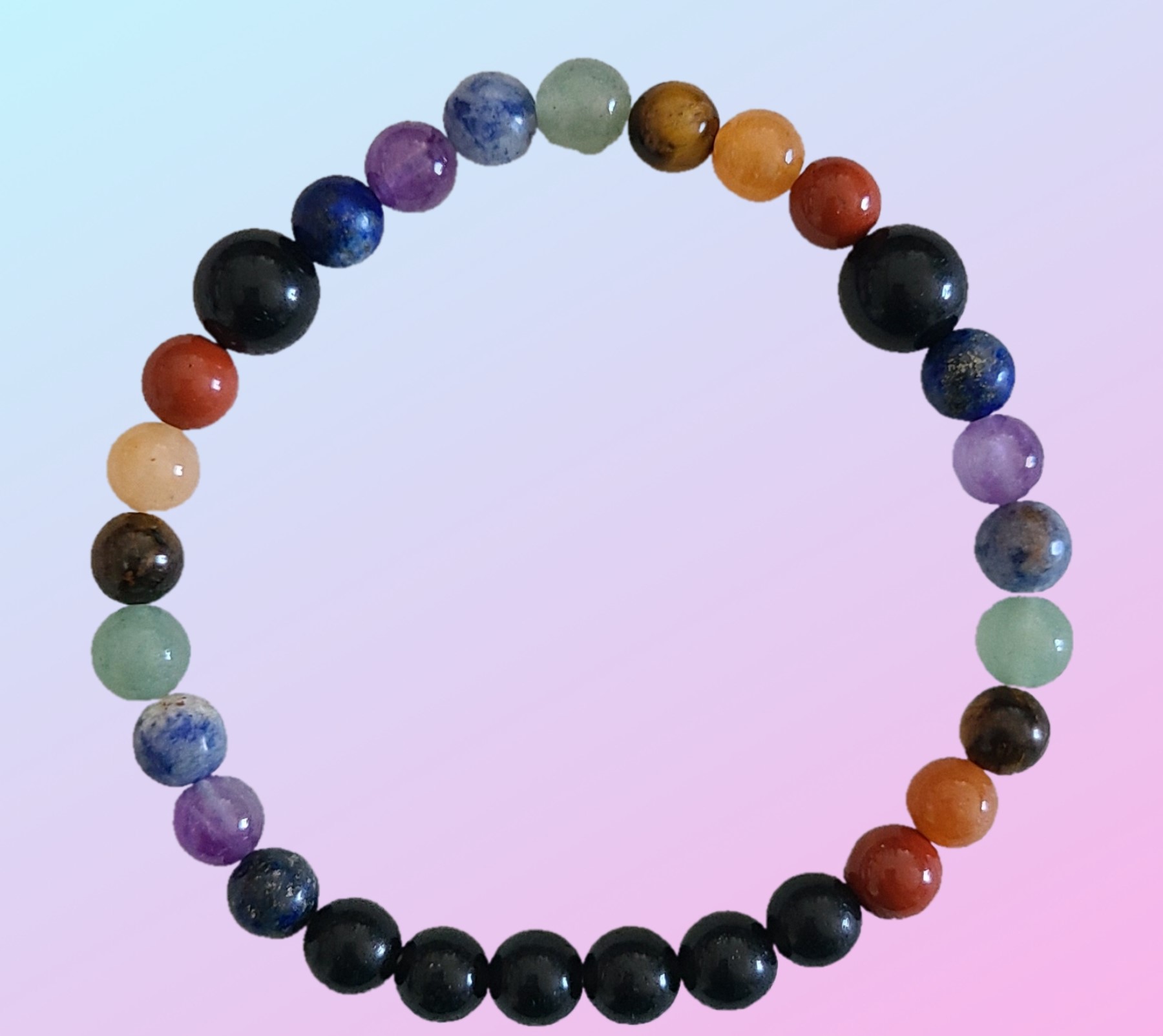 We are happy to unveil our newest item, The Chakra Bracelet! This alluring bracelet is made up of Red Jasper (red), Carnelian (orange), Golden Tigers Eye (yellow), Green Aventurine (green), Sodalite (blue), Lapis Lazuli (indigo), Amethyst (violet). These crystals are believed to help balance and align the seven chakras in your body. It is paired with Black Obsidian to help with grounding.