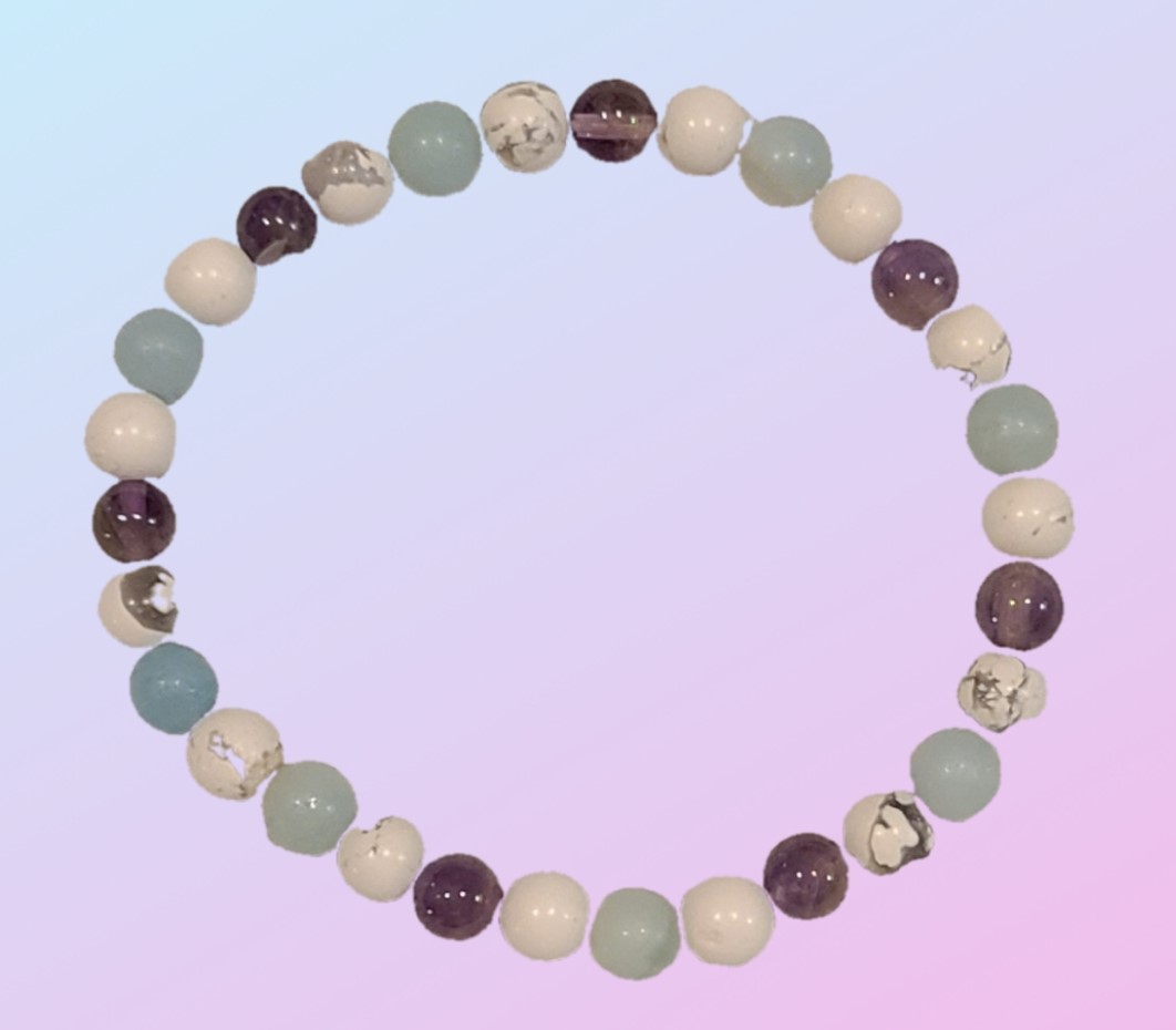 Breath in and breath out, the Zen bracelet is here. Made up of Amazonite, Amethyst, and White Howlite it is one of our most popular items. Each stone is believed to aid in relaxation, give a sense of peace, and over all calmness to those who wear them.